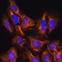 Immunofluorescent analysis of GNB1 staining in U2OS cells. Formalin-fixed cells were permeabilized with 0.1% Triton X-100 in TBS for 5-10 minutes and blocked with 3% BSA-PBS for 30 minutes at room temperature. Cells were probed with the primary antibody in 3% BSA-PBS and incubated overnight at 4 °C in a humidified chamber. Cells were washed with PBST and incubated with a AF594-conjugated secondary antibody (red) in PBS at room temperature in the dark. DAPI was used to stain the cell nuclei (blue). Immunofluorescent analysis of GNB1 staining in U2OS cells. Formalin-fixed cells were permeabilized with 0.1% Triton X-100 in TBS for 5-10 minutes and blocked with 3% BSA-PBS for 30 minutes at room temperature. Cells were probed with the primary antibody in 3% BSA-PBS and incubated overnight at 4 °C in a humidified chamber. Cells were washed with PBST and incubated with a AF594-conjugated secondary antibody (red) in PBS at room temperature in the dark. DAPI was used to stain the cell nuclei (blue).