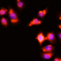 Immunofluorescent analysis of HOXA11 staining in HeLa cells. Formalin-fixed cells were permeabilized with 0.1% Triton X-100 in TBS for 5-10 minutes and blocked with 3% BSA-PBS for 30 minutes at room temperature. Cells were probed with the primary antibody in 3% BSA-PBS and incubated overnight at 4 °C in a humidified chamber. Cells were washed with PBST and incubated with a AF594-conjugated secondary antibody (red) in PBS at room temperature in the dark. DAPI was used to stain the cell nuclei (blue).