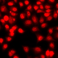 Immunofluorescent analysis of Histone H3 (MonoMethyl-R26) staining in HEK293T cells. Formalin-fixed cells were permeabilized with 0.1% Triton X-100 in TBS for 5-10 minutes and blocked with 3% BSA-PBS for 30 minutes at room temperature. Cells were probed with the primary antibody in 3% BSA-PBS and incubated overnight at 4 °C in a humidified chamber. Cells were washed with PBST and incubated with a DyLight 594-conjugated secondary antibody (red) in PBS at room temperature in the dark.