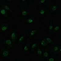 Immunofluorescent analysis of PELP1 staining in L929 cells. Formalin-fixed cells were permeabilized with 0.1% Triton X-100 in TBS for 5-10 minutes and blocked with 3% BSA-PBS for 30 minutes at room temperature. Cells were probed with the primary antibody in 3% BSA-PBS and incubated overnight at 4 °C in a humidified chamber. Cells were washed with PBST and incubated with a AF488-conjugated secondary antibody (green) in PBS at room temperature in the dark. DAPI was used to stain the cell nuclei (blue).