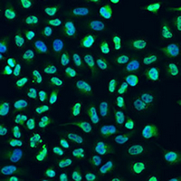 Immunofluorescent analysis of STAU2 staining in U2OS cells. Formalin-fixed cells were permeabilized with 0.1% Triton X-100 in TBS for 5-10 minutes and blocked with 3% BSA-PBS for 30 minutes at room temperature. Cells were probed with the primary antibody in 3% BSA-PBS and incubated overnight at 4 °C in a humidified chamber. Cells were washed with PBST and incubated with a AF488-conjugated secondary antibody (green) in PBS at room temperature in the dark. DAPI was used to stain the cell nuclei (blue).