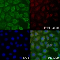 Immunofluorescent analysis of PIEZO1 staining in A549 cells. Formalin-fixed cells were permeabilized with 0.1% Triton X-100 in TBS for 5-10 minutes and blocked with 3% BSA-PBS for 30 minutes at room temperature. Cells were probed with the primary antibody in 3% BSA-PBS and incubated overnight at 4 °C in a hidified chamber. Cells were washed with PBST and incubated with a AF488-conjugated secondary antibody (green) in PBS at room temperature in the dark. Phalloidin - AF594 was used to stain Actin filaments (red). DAPI was used to stain the cell nuclei (blue).