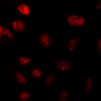 Immunofluorescent analysis of DNMT1 staining in A549 cells. Formalin-fixed cells were permeabilized with 0.1% Triton X-100 in TBS for 5-10 minutes and blocked with 3% BSA-PBS for 30 minutes at room temperature. Cells were probed with the primary antibody in 3% BSA-PBS and incubated overnight at 4 °C in a humidified chamber. Cells were washed with PBST and incubated with a DyLight 594-conjugated secondary antibody (red) in PBS at room temperature in the dark.