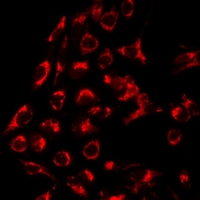 Immunofluorescent analysis of Serpin A6 staining in U2OS cells. Formalin-fixed cells were permeabilized with 0.1% Triton X-100 in TBS for 5-10 minutes and blocked with 3% BSA-PBS for 30 minutes at room temperature. Cells were probed with the primary antibody in 3% BSA-PBS and incubated overnight at 4 °C in a humidified chamber. Cells were washed with PBST and incubated with a DyLight 594-conjugated secondary antibody (red) in PBS at room temperature in the dark.