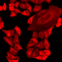 Immunofluorescent analysis of MRPS30 staining in HeLa cells. Formalin-fixed cells were permeabilized with 0.1% Triton X-100 in TBS for 5-10 minutes and blocked with 3% BSA-PBS for 30 minutes at room temperature. Cells were probed with the primary antibody in 3% BSA-PBS and incubated overnight at 4 °C in a humidified chamber. Cells were washed with PBST and incubated with a DyLight 594-conjugated secondary antibody (red) in PBS at room temperature in the dark.