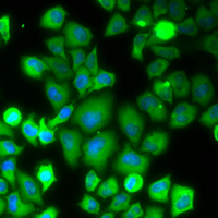 Immunofluorescent analysis of RPS10 staining in MCF7 cells . Formalin-fixed cells were permeabilized with 0.1% Triton X-100 in TBS for 5-10 minutes and blocked with 3% BSA-PBS for 30 minutes at room temperature. Cells were probed with the primary antibody in 3% BSA-PBS and incubated overnight at 4 °C in a humidified chamber. Cells were washed with PBST and incubated with a AF488-conjugated secondary antibody (green) in PBS at room temperature in the dark. DAPI was used to stain the cell nuclei (blue).