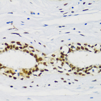 Immunohistochemical analysis of CIRBP staining in human breast cancer formalin fixed paraffin embedded tissue section. The section was pre-treated using heat mediated antigen retrieval with sodium citrate buffer (pH 6.0). The section was then incubated with the antibody at room temperature and detected using an HRP conjugated compact polymer system. DAB was used as the chromogen. The section was then counterstained with haematoxylin and mounted with DPX.