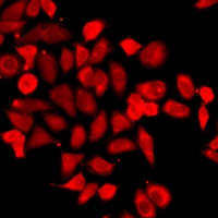 Immunofluorescent analysis of BLZF1 staining in HeLa cells. Formalin-fixed cells were permeabilized with 0.1% Triton X-100 in TBS for 5-10 minutes and blocked with 3% BSA-PBS for 30 minutes at room temperature. Cells were probed with the primary antibody in 3% BSA-PBS and incubated overnight at 4 °C in a humidified chamber. Cells were washed with PBST and incubated with a DyLight 594-conjugated secondary antibody (red) in PBS at room temperature in the dark.