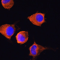 Immunofluorescent analysis of CD228 staining in L929 cells. Formalin-fixed cells were permeabilized with 0.1% Triton X-100 in TBS for 5-10 minutes and blocked with 3% BSA-PBS for 30 minutes at room temperature. Cells were probed with the primary antibody in 3% BSA-PBS and incubated overnight at 4 °C in a humidified chamber. Cells were washed with PBST and incubated with a AF594-conjugated secondary antibody (red) in PBS at room temperature in the dark. DAPI was used to stain the cell nuclei (blue).
