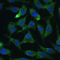 Immunofluorescent analysis of eIF2C2 staining in L929 cells. Formalin-fixed cells were permeabilized with 0.1% Triton X-100 in TBS for 5-10 minutes and blocked with 3% BSA-PBS for 30 minutes at room temperature. Cells were probed with the primary antibody in 3% BSA-PBS and incubated overnight at 4 °C in a humidified chamber. Cells were washed with PBST and incubated with a AF488-conjugated secondary antibody (green) in PBS at room temperature in the dark. DAPI was used to stain the cell nuclei (blue).