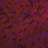 Immunofluorescent analysis of Complement C3 staining in rat liver. Formalin-fixed cells were permeabilized with 0.1% Triton X-100 in TBS for 5-10 minutes and blocked with 3% BSA-PBS for 30 minutes at room temperature. Cells were probed with the primary antibody in 3% BSA-PBS and incubated overnight at 4 °C in a humidified chamber. Cells were washed with PBST and incubated with a AF594-conjugated secondary antibody (red) in PBS at room temperature in the dark.