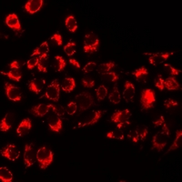 Immunofluorescent analysis of GIF staining in A549 cells. Formalin-fixed cells were permeabilized with 0.1% Triton X-100 in TBS for 5-10 minutes and blocked with 3% BSA-PBS for 30 minutes at room temperature. Cells were probed with the primary antibody in 3% BSA-PBS and incubated overnight at 4 °C in a humidified chamber. Cells were washed with PBST and incubated with a DyLight 594-conjugated secondary antibody (red) in PBS at room temperature in the dark.
