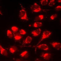 Immunofluorescent analysis of Serglycin staining in HeLa cells. Formalin-fixed cells were permeabilized with 0.1% Triton X-100 in TBS for 5-10 minutes and blocked with 3% BSA-PBS for 30 minutes at room temperature. Cells were probed with the primary antibody in 3% BSA-PBS and incubated overnight at 4 °C in a humidified chamber. Cells were washed with PBST and incubated with a DyLight 594-conjugated secondary antibody (red) in PBS at room temperature in the dark.