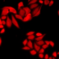 Immunofluorescent analysis of COPS2 staining in U2OS cells. Formalin-fixed cells were permeabilized with 0.1% Triton X-100 in TBS for 5-10 minutes and blocked with 3% BSA-PBS for 30 minutes at room temperature. Cells were probed with the primary antibody in 3% BSA-PBS and incubated overnight at 4 °C in a humidified chamber. Cells were washed with PBST and incubated with a DyLight 594-conjugated secondary antibody (red) in PBS at room temperature in the dark.