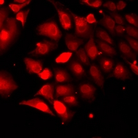 Immunofluorescent analysis of TRAF4 staining in A549 cells. Formalin-fixed cells were permeabilized with 0.1% Triton X-100 in TBS for 5-10 minutes and blocked with 3% BSA-PBS for 30 minutes at room temperature. Cells were probed with the primary antibody in 3% BSA-PBS and incubated overnight at 4 °C in a humidified chamber. Cells were washed with PBST and incubated with a DyLight 594-conjugated secondary antibody (red) in PBS at room temperature in the dark.