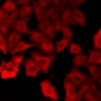 Immunofluorescent analysis of VPS4A staining in A549 cells. Formalin-fixed cells were permeabilized with 0.1% Triton X-100 in TBS for 5-10 minutes and blocked with 3% BSA-PBS for 30 minutes at room temperature. Cells were probed with the primary antibody in 3% BSA-PBS and incubated overnight at 4 °C in a humidified chamber. Cells were washed with PBST and incubated with a DyLight 594-conjugated secondary antibody (red) in PBS at room temperature in the dark.