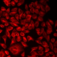 Immunofluorescent analysis of ALS2CR6 staining in A549 cells. Formalin-fixed cells were permeabilized with 0.1% Triton X-100 in TBS for 5-10 minutes and blocked with 3% BSA-PBS for 30 minutes at room temperature. Cells were probed with the primary antibody in 3% BSA-PBS and incubated overnight at 4 °C in a humidified chamber. Cells were washed with PBST and incubated with a DyLight 594-conjugated secondary antibody (red) in PBS at room temperature in the dark.