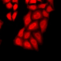Immunofluorescent analysis of GSTCD staining in A549 cells. Formalin-fixed cells were permeabilized with 0.1% Triton X-100 in TBS for 5-10 minutes and blocked with 3% BSA-PBS for 30 minutes at room temperature. Cells were probed with the primary antibody in 3% BSA-PBS and incubated overnight at 4 °C in a humidified chamber. Cells were washed with PBST and incubated with a DyLight 594-conjugated secondary antibody (red) in PBS at room temperature in the dark.