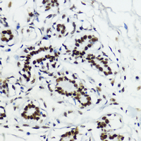 Immunohistochemical analysis of Histone H3 (Acetyl-K27) staining in human breast formalin fixed paraffin embedded tissue section. The section was pre-treated using heat mediated antigen retrieval with sodium citrate buffer (pH 6.0). The section was then incubated with the antibody at room temperature and detected using an HRP conjugated compact polymer system. DAB was used as the chromogen. The section was then counterstained with haematoxylin and mounted with DPX. -
