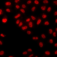Immunofluorescent analysis of ATMIN staining in MCF7 cells. Formalin-fixed cells were permeabilized with 0.1% Triton X-100 in TBS for 5-10 minutes and blocked with 3% BSA-PBS for 30 minutes at room temperature. Cells were probed with the primary antibody in 3% BSA-PBS and incubated overnight at 4 °C in a humidified chamber. Cells were washed with PBST and incubated with a DyLight 594-conjugated secondary antibody (red) in PBS at room temperature in the dark.