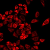 Immunofluorescent analysis of TMLHE staining in MCF7 cells. Formalin-fixed cells were permeabilized with 0.1% Triton X-100 in TBS for 5-10 minutes and blocked with 3% BSA-PBS for 30 minutes at room temperature. Cells were probed with the primary antibody in 3% BSA-PBS and incubated overnight at 4 °C in a humidified chamber. Cells were washed with PBST and incubated with a DyLight 594-conjugated secondary antibody (red) in PBS at room temperature in the dark.