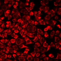 Immunofluorescent analysis of SULT1E1 staining in A549 cells. Formalin-fixed cells were permeabilized with 0.1% Triton X-100 in TBS for 5-10 minutes and blocked with 3% BSA-PBS for 30 minutes at room temperature. Cells were probed with the primary antibody in 3% BSA-PBS and incubated overnight at 4 °C in a humidified chamber. Cells were washed with PBST and incubated with a DyLight 594-conjugated secondary antibody (red) in PBS at room temperature in the dark.