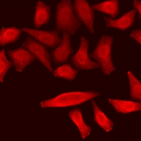 Immunofluorescent analysis of RPS6KL1 staining in A549 cells. Formalin-fixed cells were permeabilized with 0.1% Triton X-100 in TBS for 5-10 minutes and blocked with 3% BSA-PBS for 30 minutes at room temperature. Cells were probed with the primary antibody in 3% BSA-PBS and incubated overnight at 4 °C in a humidified chamber. Cells were washed with PBST and incubated with a DyLight 594-conjugated secondary antibody (red) in PBS at room temperature in the dark.