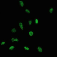 Immunofluorescent analysis of SAF-B1 staining in U2OS cells. Formalin-fixed cells were permeabilized with 0.1% Triton X-100 in TBS for 5-10 minutes and blocked with 3% BSA-PBS for 30 minutes at room temperature. Cells were probed with the primary antibody in 3% BSA-PBS and incubated overnight at 4 °C in a humidified chamber. Cells were washed with PBST and incubated with a AF488-conjugated secondary antibody (green) in PBS at room temperature in the dark. DAPI was used to stain the cell nuclei (blue).