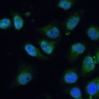 Immunofluorescent analysis of CPS1 staining in HeLa cells. Formalin-fixed cells were permeabilized with 0.1% Triton X-100 in TBS for 5-10 minutes and blocked with 3% BSA-PBS for 30 minutes at room temperature. Cells were probed with the primary antibody in 3% BSA-PBS and incubated overnight at 4 °C in a humidified chamber. Cells were washed with PBST and incubated with a AF488-conjugated secondary antibody (green) in PBS at room temperature in the dark. DAPI was used to stain the cell nuclei (blue).
