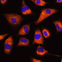 Immunofluorescent analysis of GNB2 staining in L929 cells. Formalin-fixed cells were permeabilized with 0.1% Triton X-100 in TBS for 5-10 minutes and blocked with 3% BSA-PBS for 30 minutes at room temperature. Cells were probed with the primary antibody in 3% BSA-PBS and incubated overnight at 4 °C in a humidified chamber. Cells were washed with PBST and incubated with a AF594-conjugated secondary antibody (red) in PBS at room temperature in the dark. DAPI was used to stain the cell nuclei (blue).