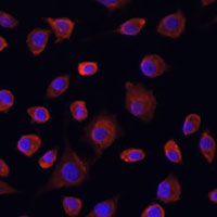 Immunofluorescent analysis of ULK1 staining in L929 cells. Formalin-fixed cells were permeabilized with 0.1% Triton X-100 in TBS for 5-10 minutes and blocked with 3% BSA-PBS for 30 minutes at room temperature. Cells were probed with the primary antibody in 3% BSA-PBS and incubated overnight at 4 °C in a humidified chamber. Cells were washed with PBST and incubated with a AF594-conjugated secondary antibody (red) in PBS at room temperature in the dark. DAPI was used to stain the cell nuclei (blue).