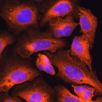 Immunofluorescent analysis of CKAP5 staining in U2OS cells. Formalin-fixed cells were permeabilized with 0.1% Triton X-100 in TBS for 5-10 minutes and blocked with 3% BSA-PBS for 30 minutes at room temperature. Cells were probed with the primary antibody in 3% BSA-PBS and incubated overnight at 4 °C in a humidified chamber. Cells were washed with PBST and incubated with a AF594-conjugated secondary antibody (red) in PBS at room temperature in the dark. DAPI was used to stain the cell nuclei (blue).