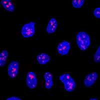 Immunofluorescent analysis of EBP2 staining in U2OS cells. Formalin-fixed cells were permeabilized with 0.1% Triton X-100 in TBS for 5-10 minutes and blocked with 3% BSA-PBS for 30 minutes at room temperature. Cells were probed with the primary antibody in 3% BSA-PBS and incubated overnight at 4 °C in a humidified chamber. Cells were washed with PBST and incubated with a AF594-conjugated secondary antibody (red) in PBS at room temperature in the dark. DAPI was used to stain the cell nuclei (blue).