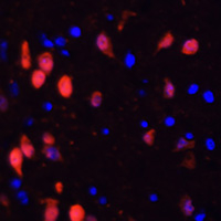 Immunofluorescent analysis of Calretinin staining in rat brain. Formalin-fixed cells were permeabilized with 0.1% Triton X-100 in TBS for 5-10 minutes and blocked with 3% BSA-PBS for 30 minutes at room temperature. Cells were probed with the primary antibody in 3% BSA-PBS and incubated overnight at 4 °C in a humidified chamber. Cells were washed with PBST and incubated with a AF594-conjugated secondary antibody (red) in PBS at room temperature in the dark. DAPI was used to stain the cell nuclei (blue).