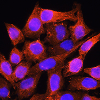 Immunofluorescent analysis of AMT staining in HeLa cells. Formalin-fixed cells were permeabilized with 0.1% Triton X-100 in TBS for 5-10 minutes and blocked with 3% BSA-PBS for 30 minutes at room temperature. Cells were probed with the primary antibody in 3% BSA-PBS and incubated overnight at 4 °C in a humidified chamber. Cells were washed with PBST and incubated with a AF594-conjugated secondary antibody (red) in PBS at room temperature in the dark. DAPI was used to stain the cell nuclei (blue).