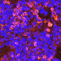 Immunofluorescent analysis of CD19 staining in mouse spleen. Formalin-fixed cells were permeabilized with 0.1% Triton X-100 in TBS for 5-10 minutes and blocked with 3% BSA-PBS for 30 minutes at room temperature. Cells were probed with the primary antibody in 3% BSA-PBS and incubated overnight at 4 °C in a humidified chamber. Cells were washed with PBST and incubated with a AF594-conjugated secondary antibody (red) in PBS at room temperature in the dark. DAPI was used to stain the cell nuclei (blue).
