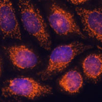 Immunofluorescent analysis of MTMR9 staining in HeLa cells. Formalin-fixed cells were permeabilized with 0.1% Triton X-100 in TBS for 5-10 minutes and blocked with 3% BSA-PBS for 30 minutes at room temperature. Cells were probed with the primary antibody in 3% BSA-PBS and incubated overnight at 4 °C in a humidified chamber. Cells were washed with PBST and incubated with a AF594-conjugated secondary antibody (red) in PBS at room temperature in the dark. DAPI was used to stain the cell nuclei (blue).
