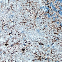 Immunohistochemical analysis of GFAP staining in human brain formalin fixed paraffin embedded tissue section. The section was pre-treated using heat mediated antigen retrieval with sodium citrate buffer (pH 6.0). The section was then incubated with the antibody at room temperature and detected using an HRP conjugated compact polymer system. DAB was used as the chromogen. The section was then counterstained with haematoxylin and mounted with DPX. -