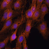 Immunofluorescent analysis of COMMD5 staining in C6 cells. Formalin-fixed cells were permeabilized with 0.1% Triton X-100 in TBS for 5-10 minutes and blocked with 3% BSA-PBS for 30 minutes at room temperature. Cells were probed with the primary antibody in 3% BSA-PBS and incubated overnight at 4 °C in a humidified chamber. Cells were washed with PBST and incubated with a AF594-conjugated secondary antibody (red) in PBS at room temperature in the dark. DAPI was used to stain the cell nuclei (blue).