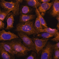 Immunofluorescent analysis of Septin 5 staining in U2OS cells. Formalin-fixed cells were permeabilized with 0.1% Triton X-100 in TBS for 5-10 minutes and blocked with 3% BSA-PBS for 30 minutes at room temperature. Cells were probed with the primary antibody in 3% BSA-PBS and incubated overnight at 4 °C in a humidified chamber. Cells were washed with PBST and incubated with a AF594-conjugated secondary antibody (red) in PBS at room temperature in the dark. DAPI was used to stain the cell nuclei (blue).