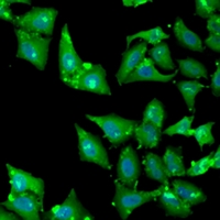 Immunofluorescent analysis of AGA staining in HeLa cells. Formalin-fixed cells were permeabilized with 0.1% Triton X-100 in TBS for 5-10 minutes and blocked with 3% BSA-PBS for 30 minutes at room temperature. Cells were probed with the primary antibody in 3% BSA-PBS and incubated overnight at 4 °C in a hidified chamber. Cells were washed with PBST and incubated with a Alexa Fluor 488-conjugated secondary antibody (green) in PBS at room temperature in the dark.