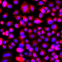 Immunofluorescent analysis of ALG1 staining in A549 cells. Formalin-fixed cells were permeabilized with 0.1% Triton X-100 in TBS for 5-10 minutes and blocked with 3% BSA-PBS for 30 minutes at room temperature. Cells were probed with the primary antibody in 3% BSA-PBS and incubated overnight at 4 °C in a hidified chamber. Cells were washed with PBST and incubated with a Alexa Fluor 594-conjugated secondary antibody (red) in PBS at room temperature in the dark.