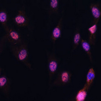 Immunofluorescent analysis of 5-Lipoxygenase staining in C6 cells. Formalin-fixed cells were permeabilized with 0.1% Triton X-100 in TBS for 5-10 minutes and blocked with 3% BSA-PBS for 30 minutes at room temperature. Cells were probed with the primary antibody in 3% BSA-PBS and incubated overnight at 4 °C in a humidified chamber. Cells were washed with PBST and incubated with a AF594-conjugated secondary antibody (red) in PBS at room temperature in the dark. DAPI was used to stain the cell nuclei (blue).