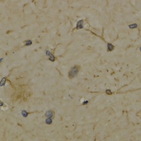 Immunohistochemical analysis of 5-Lipoxygenase staining in rat brain formalin fixed paraffin embedded tissue section. The section was pre-treated using heat mediated antigen retrieval with sodium citrate buffer (pH 6.0). The section was then incubated with the antibody at room temperature and detected using an HRP conjugated compact polymer system. DAB was used as the chromogen. The section was then counterstained with haematoxylin and mounted with DPX. -