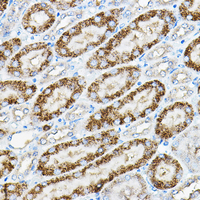 Immunohistochemical analysis of ALPL staining in mouse kidney formalin fixed paraffin embedded tissue section. The section was pre-treated using heat mediated antigen retrieval with sodium citrate buffer (pH 6.0). The section was then incubated with the antibody at room temperature and detected using an HRP conjugated compact polymer system. DAB was used as the chromogen. The section was then counterstained with haematoxylin and mounted with DPX.