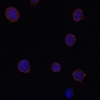Immunofluorescent analysis of ANO2 staining in Y79 cells. Formalin-fixed cells were permeabilized with 0.1% Triton X-100 in TBS for 5-10 minutes and blocked with 3% BSA-PBS for 30 minutes at room temperature. Cells were probed with the primary antibody in 3% BSA-PBS and incubated overnight at 4 °C in a hidified chamber. Cells were washed with PBST and incubated with a Alexa Fluor 594-conjugated secondary antibody (red) in PBS at room temperature in the dark.