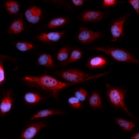 Immunofluorescent analysis of ASH2L staining in U2OS cells. Formalin-fixed cells were permeabilized with 0.1% Triton X-100 in TBS for 5-10 minutes and blocked with 3% BSA-PBS for 30 minutes at room temperature. Cells were probed with the primary antibody in 3% BSA-PBS and incubated overnight at 4 °C in a hidified chamber. Cells were washed with PBST and incubated with a Alexa Fluor 594-conjugated secondary antibody (red) in PBS at room temperature in the dark.