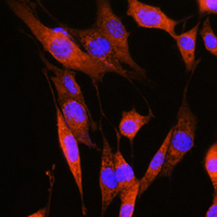 Immunofluorescent analysis of ASS1 staining in NIH3T3 cells. Formalin-fixed cells were permeabilized with 0.1% Triton X-100 in TBS for 5-10 minutes and blocked with 3% BSA-PBS for 30 minutes at room temperature. Cells were probed with the primary antibody in 3% BSA-PBS and incubated overnight at 4 °C in a humidified chamber. Cells were washed with PBST and incubated with a AF594-conjugated secondary antibody (red) in PBS at room temperature in the dark. DAPI was used to stain the cell nuclei (blue).
