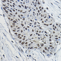 Immunohistochemical analysis of RNF52 staining in human lung cancer formalin fixed paraffin embedded tissue section. The section was pre-treated using heat mediated antigen retrieval with sodium citrate buffer (pH 6.0). The section was then incubated with the antibody at room temperature and detected using an HRP conjugated compact polymer system. DAB was used as the chromogen. The section was then counterstained with haematoxylin and mounted with DPX.