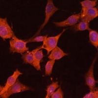 Immunofluorescent analysis of CaMK2 alpha staining in NIH3T3 cells. Formalin-fixed cells were permeabilized with 0.1% Triton X-100 in TBS for 5-10 minutes and blocked with 3% BSA-PBS for 30 minutes at room temperature. Cells were probed with the primary antibody in 3% BSA-PBS and incubated overnight at 4 °C in a hidified chamber. Cells were washed with PBST and incubated with a Alexa Fluor 594-conjugated secondary antibody (red) in PBS at room temperature in the dark.